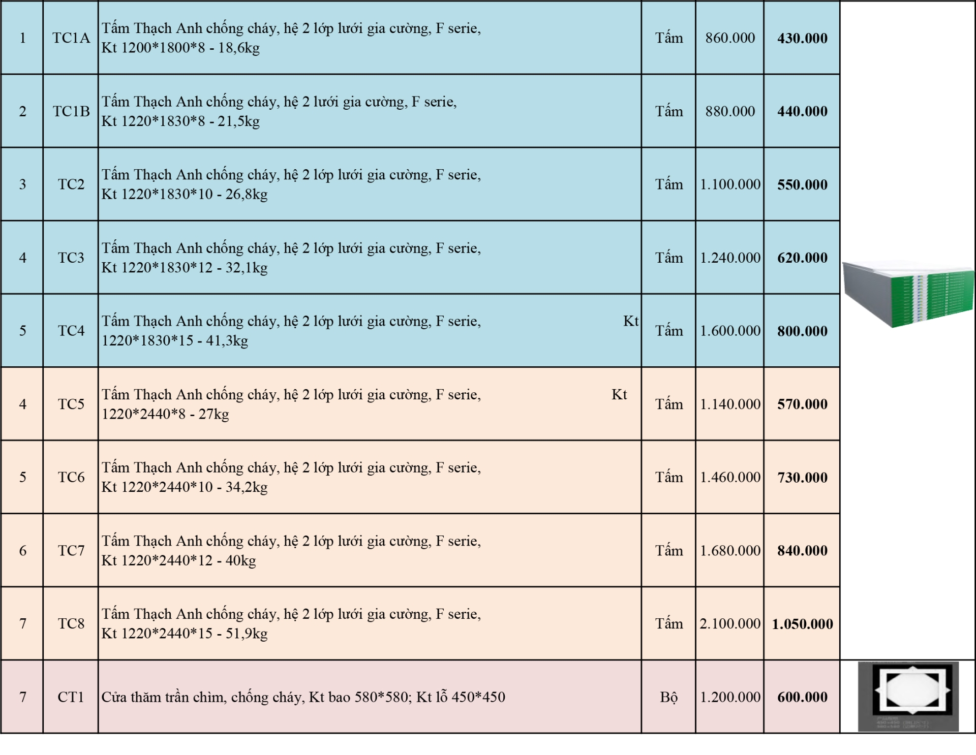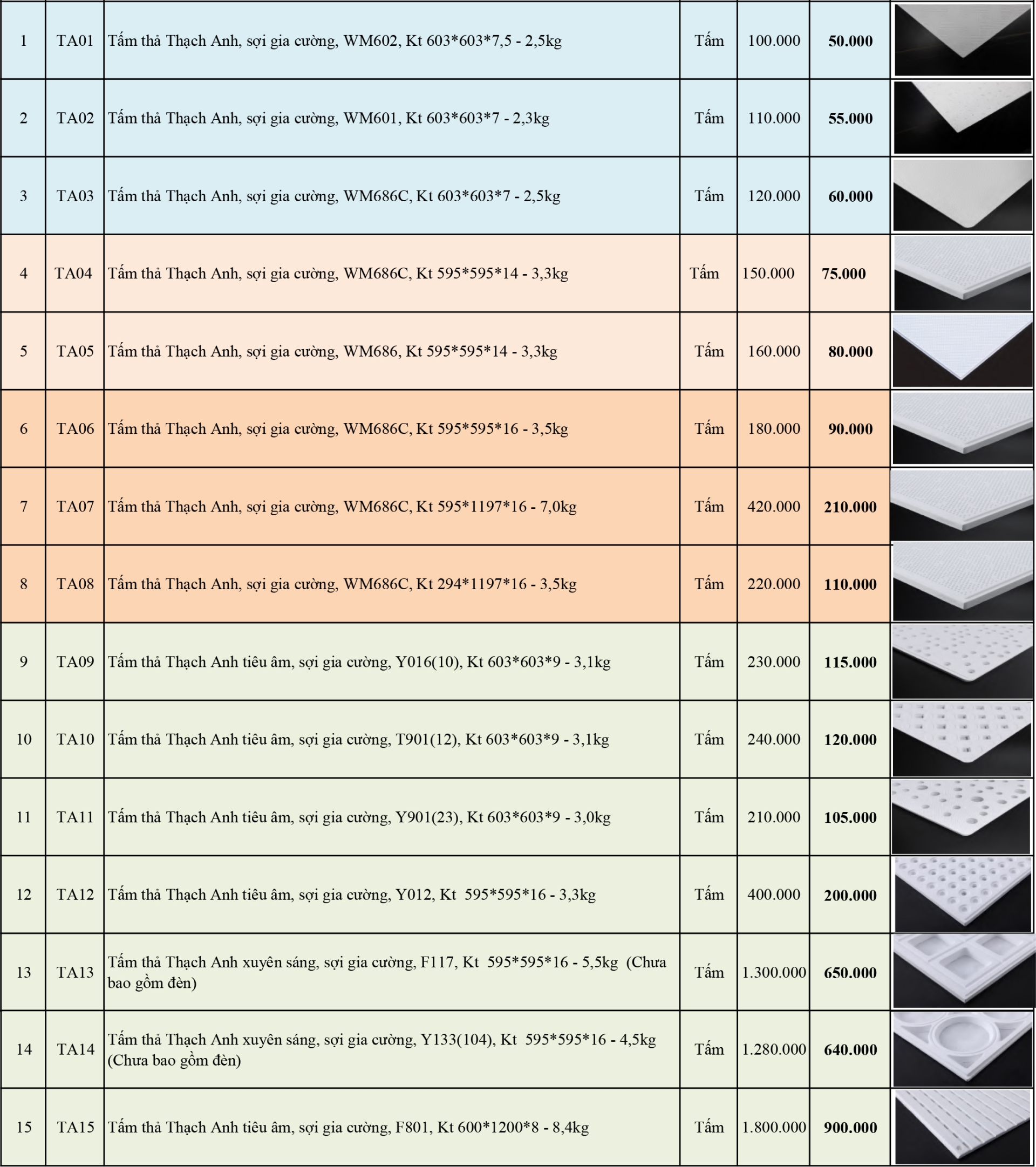 - Bảng giá đã bao gồm thuế VAT đối với hệ tấm thạch cao và chưa gồm VAT với hệ khung xương, phụ kiện.