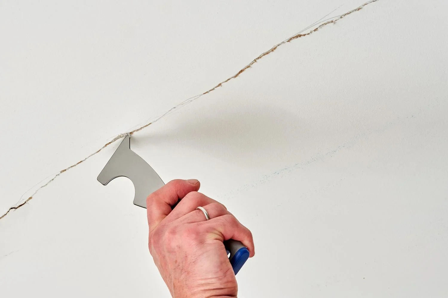 Dùng dao trét hoặc giấy nhám mịn (grit 120) làm sạch phần nứt, bong sơn và bụi bẩn xung quanh. Lau bằng khăn ẩm để bề mặt khô ráo, tránh bụi bay.