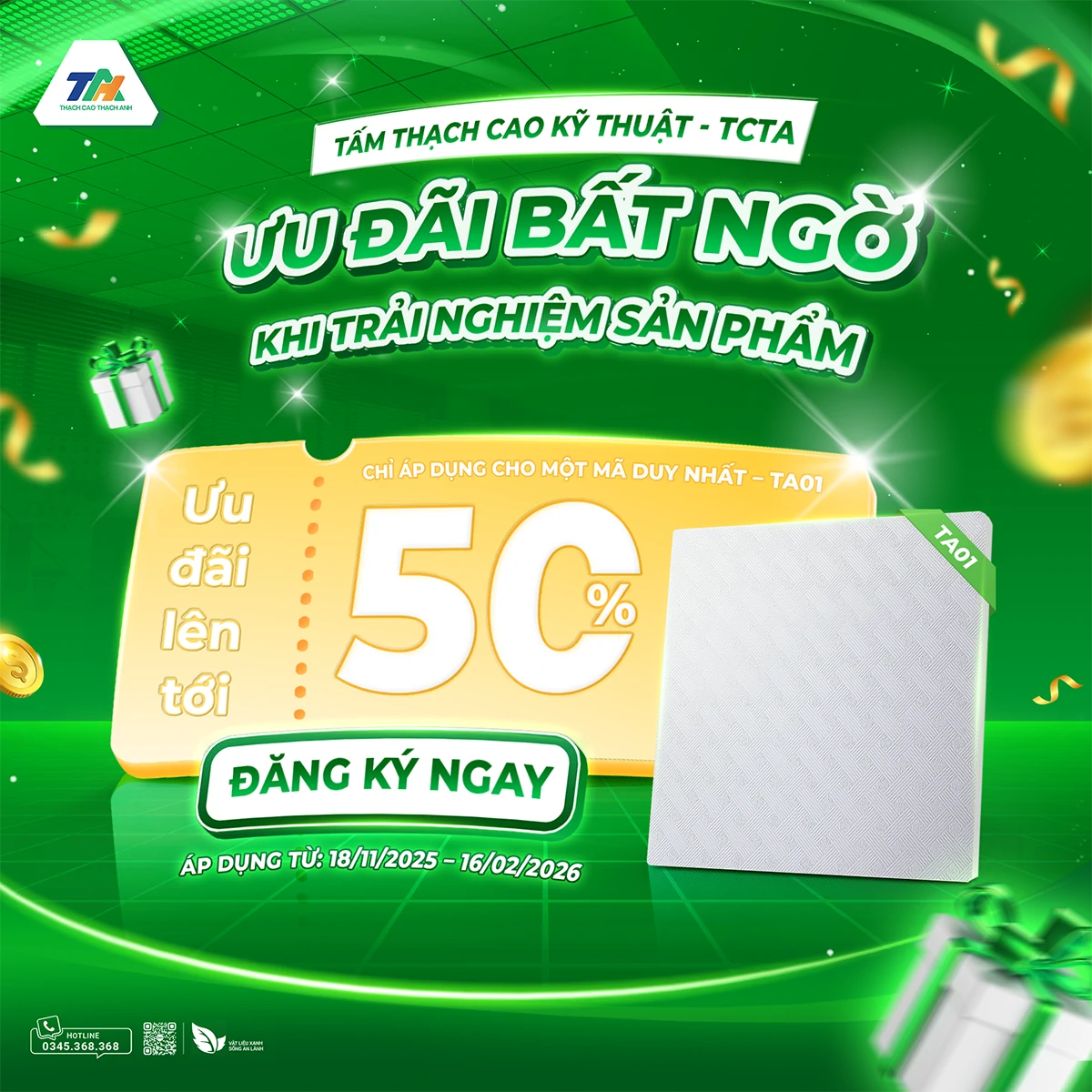 Để khách hàng được trải nghiệm trọn vẹn và rõ ràng nhất, chương trình áp dụng duy nhất với mã sản phẩm TA01, đây là một sản phẩm phù hợp cho những khách hàng đang tìm kiếm giải pháp thi công trần có yêu cầu cao về độ bền, thẩm mỹ và các tính năng an toàn cho sức khỏe. Đây cũng là cách để chúng tôi chăm sóc thật chu đáo từng nhu cầu nhỏ của khách hàng, theo sát phản hồi của khách hàng và đảm bảo trải nghiệm được xuyên suốt, rõ ràng và nhất quán.