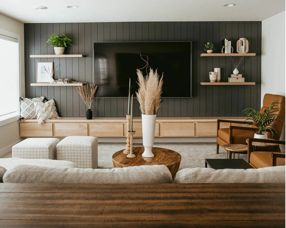 Thiết kế đồng bộ với kệ âm tường, tối ưu không gian căn hộ nhỏ. Bề mặt ốp gỗ sáng, tích hợp loa âm, theo phong cách Scandinavian 2025.