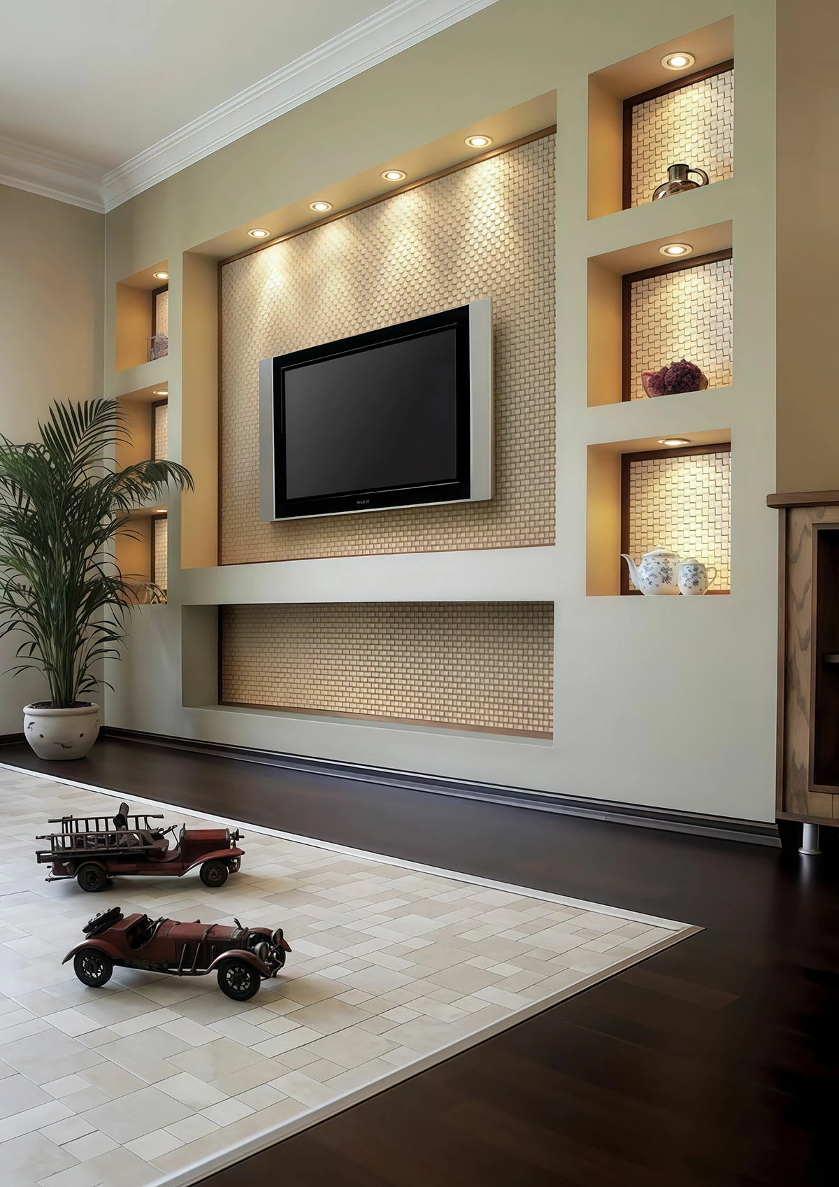 Tích hợp LED hắt sáng hoặc hốc đèn tạo hiệu ứng 3D, tăng sự ấm cúng và hiện đại cho phòng khách.
