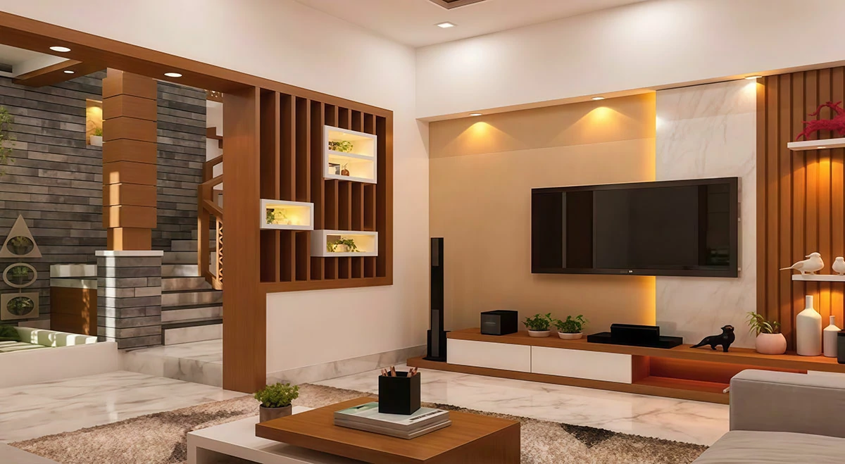 Giúp tách biệt không gian mà vẫn thông thoáng với ô kính hoặc khe hở. Có thể gắn kệ tivi, tủ rượu, hoặc ô trang trí cây xanh, tối ưu cho nhà ống.