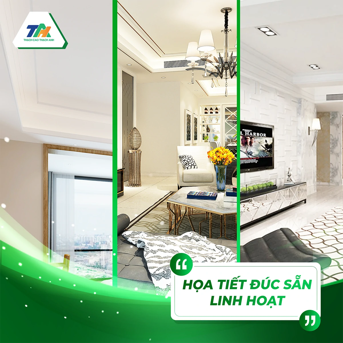TCTA cung cấp đa dạng loại tấm: phẳng, giật cấp, thả nổi, dễ dàng tùy chỉnh theo phong cách hiện đại hoặc cổ điển. Bạn có thể tạo hình uốn lượn, tích hợp hệ thống chiếu sáng thông minh, phù hợp từ nhà ở đến không gian thương mại. Với trọng lượng nhẹ (1/7 bê tông), thi công nhanh chóng chỉ 3-5 ngày cho 100m².