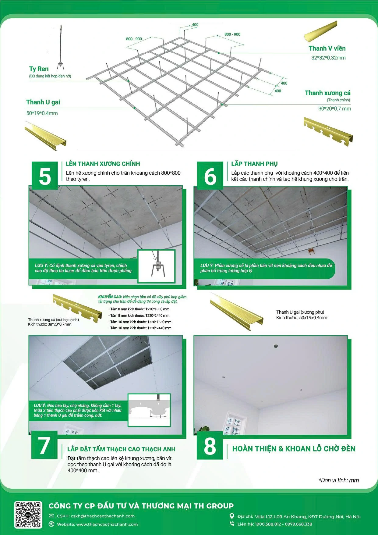 Khuyến cáo: Giữa hai thanh xương chính nên cách nhau 800mm, và giữa hai ty treo là 800mm. Khoảng cách từ trần bê tông đến trần thạch cao khoảng 10–15cm để thuận tiện thi công.