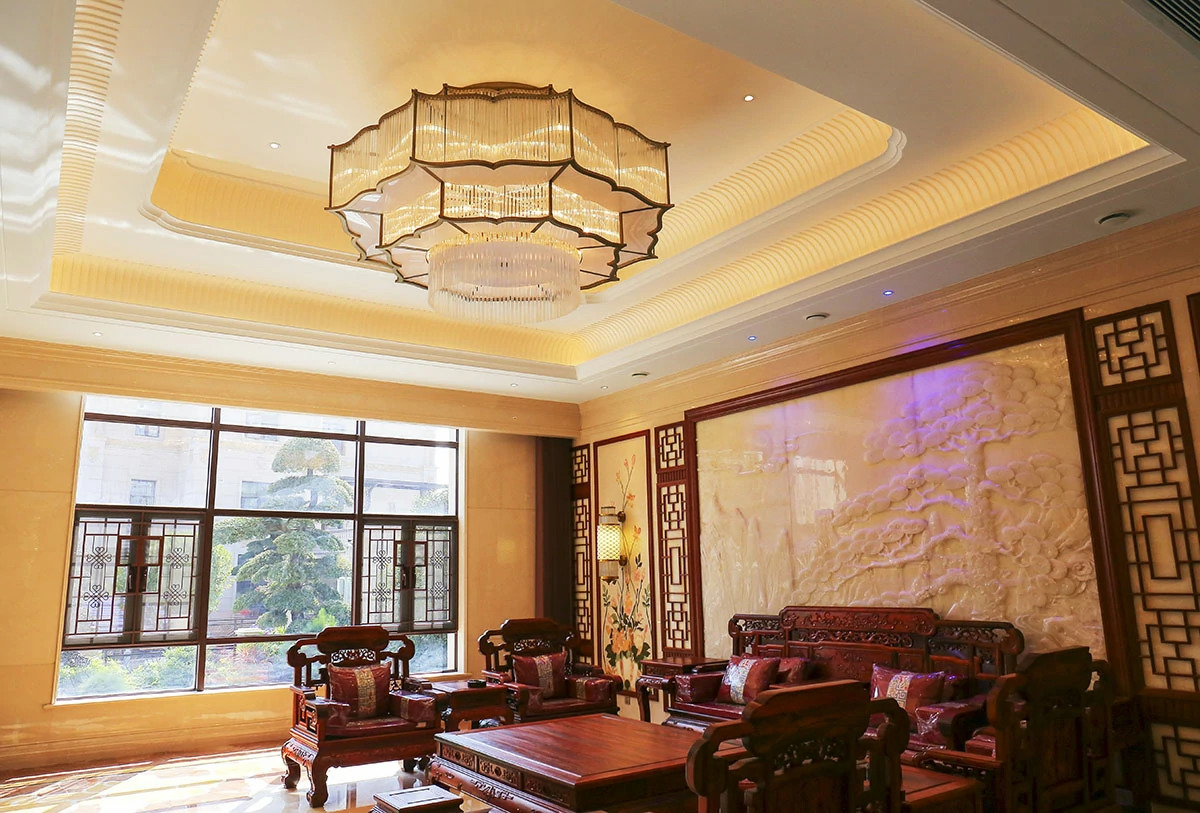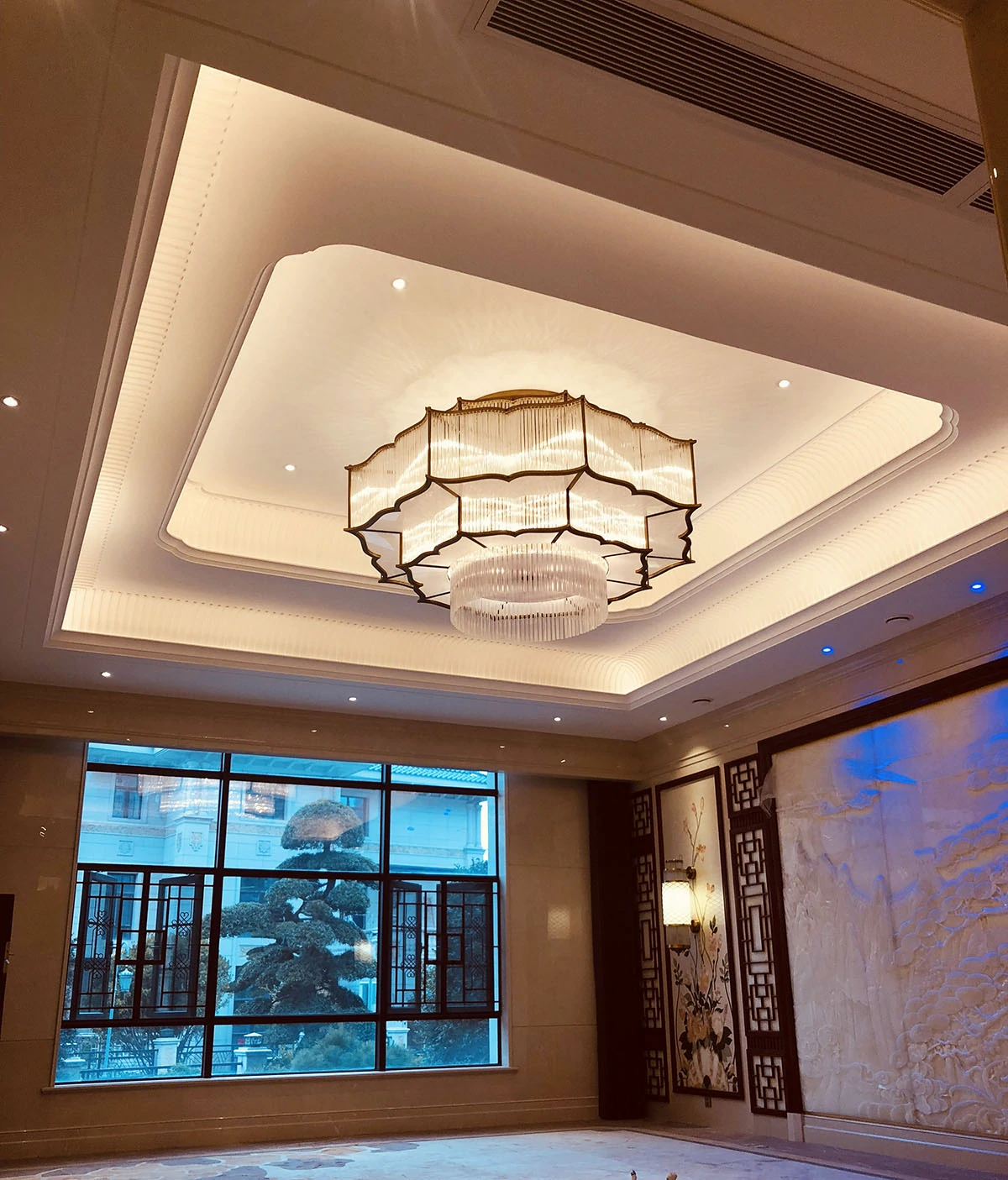 Phong cách tân cổ điển hoặc luxury, tạo điểm nhấn phòng khách với đèn chùm pha lê ở trung tâm cấp cao nhất. Phù hợp biệt thự châu Âu, tăng giá trị thẩm mỹ lên 30%.