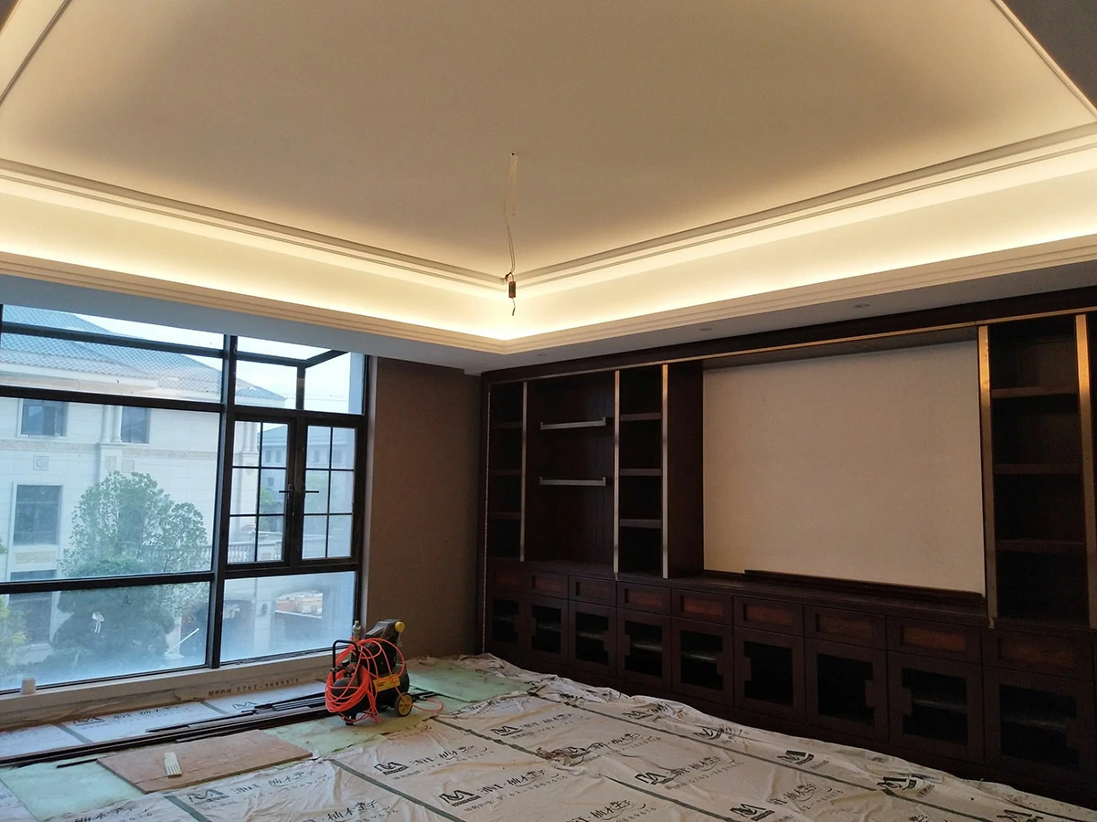 Có khe hở lắp đèn LED dây hoặc neonflex, tạo hiệu ứng ánh sáng 3D cực đẹp, rất được ưa chuộng năm 2025 nhờ tính năng thông minh. Lý tưởng cho phòng khách trẻ trung, sang trọng…