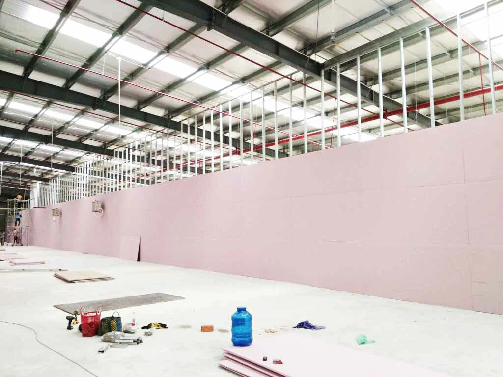Sử dụng tấm thạch cao tiêu chuẩn / chống ẩm / chống cháy (lõi hồng hoặc xanh), tùy khu vực như văn phòng hoặc kho hàng. Thi công nhanh với khung xương mạ kẽm nhẹ (0.4-0.5mm), không ảnh hưởng kết cấu thép chính, chỉ mất 1-2 ngày cho 100m². Phù hợp cho văn phòng trong nhà xưởng, phòng họp, phòng kỹ thuật, giảm tiếng ồn máy móc 40dB và ngăn cháy lan hiệu quả.