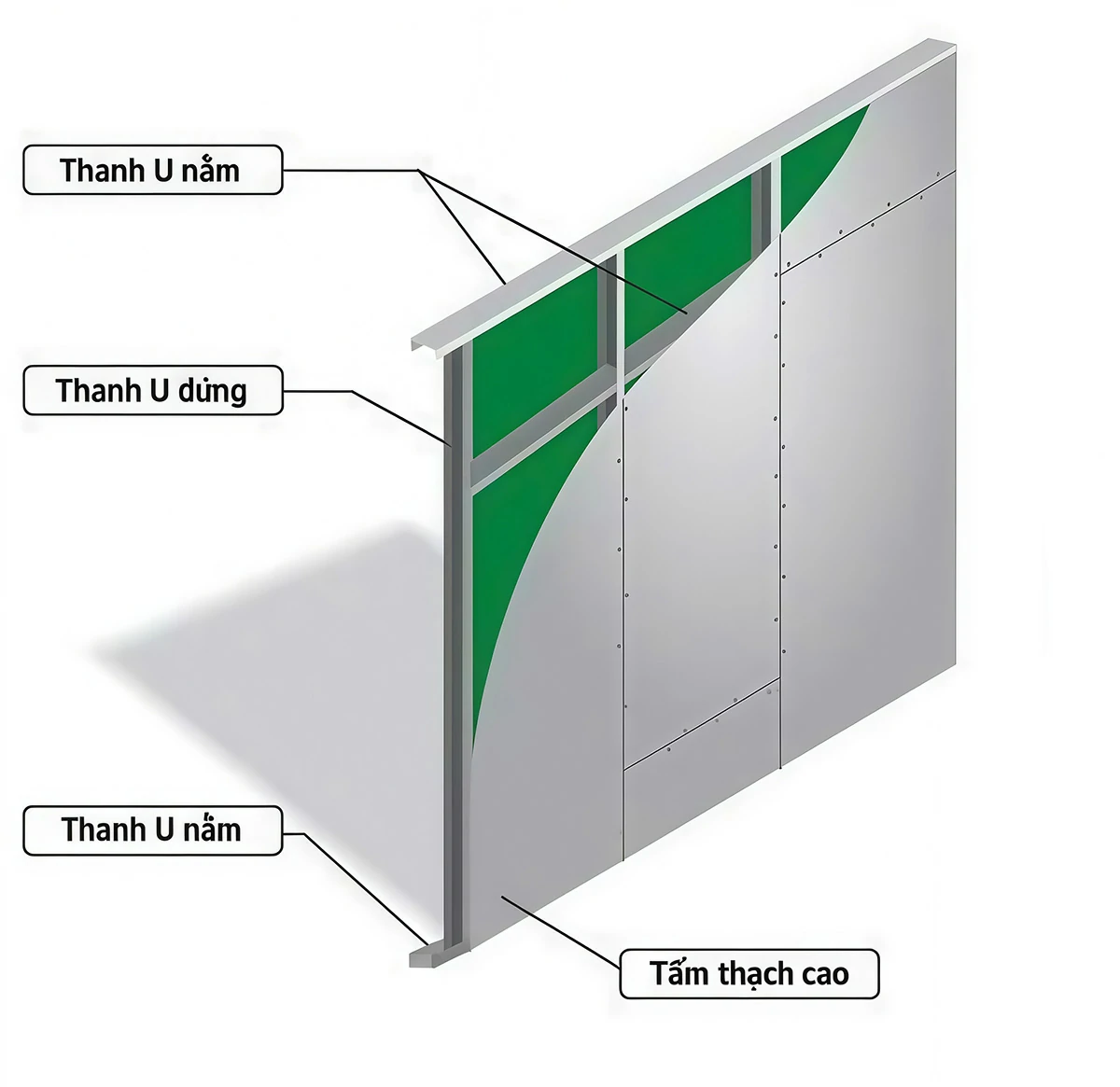 Cấu tạo chính bao gồm khung xương thép mạ kẽm (thanh U đứng và thanh U nằm, độ dày 0.4-0.5mm) làm nền tảng chịu lực, hai lớp tấm thạch cao dày 9-15mm mỗi mặt được cố định bằng vít tự khoan. Mối nối được trét bột và băng keo để tạo bề mặt phẳng. Với TCTA, khung xương áp dụng công nghệ chống gỉ sét, chịu lực lên đến 50kg/m², trong khi tấm thạch cao lõi sợi gia cường tăng độ bền chống nứt.